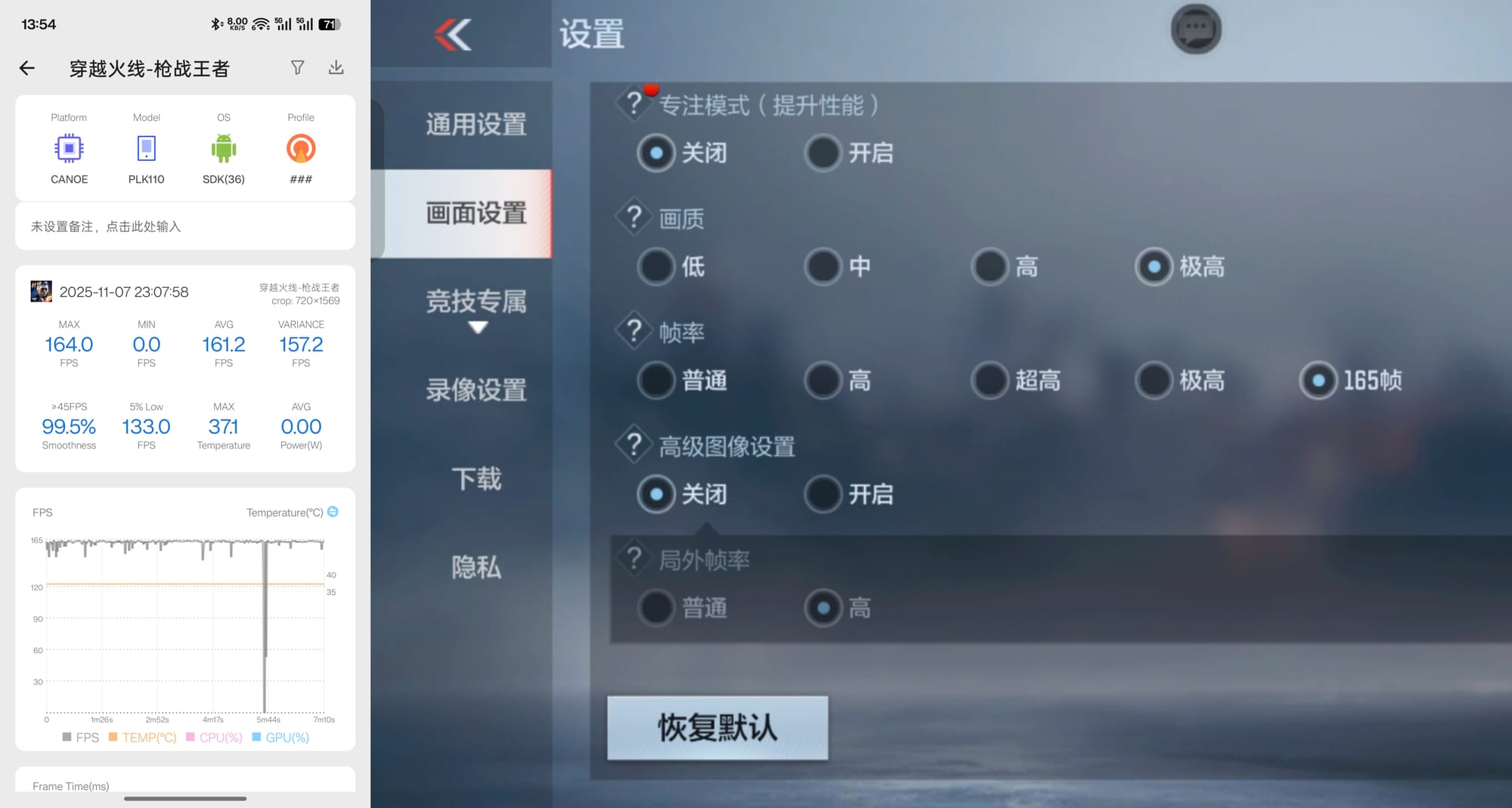 作为一个FPS 手游发烧友,我很好奇搭配165Hz屏幕的一加15在射击游戏的表现到底如何,165hz是感知不强、徒增功耗吗? 这里选择了CF 手游作为测试游戏:在开启165Hz后,跑步时的画面流畅度、射击时的精准度都有明显提升。最直观的感受是:敌人的移动轨迹更加清晰,我的反应时间感觉都变快了,点按开火键也没有120Hz出现的漏枪、吞子弹现象,打出的子弹数完全取决于手速,对比可以参考这个LivePhoto。