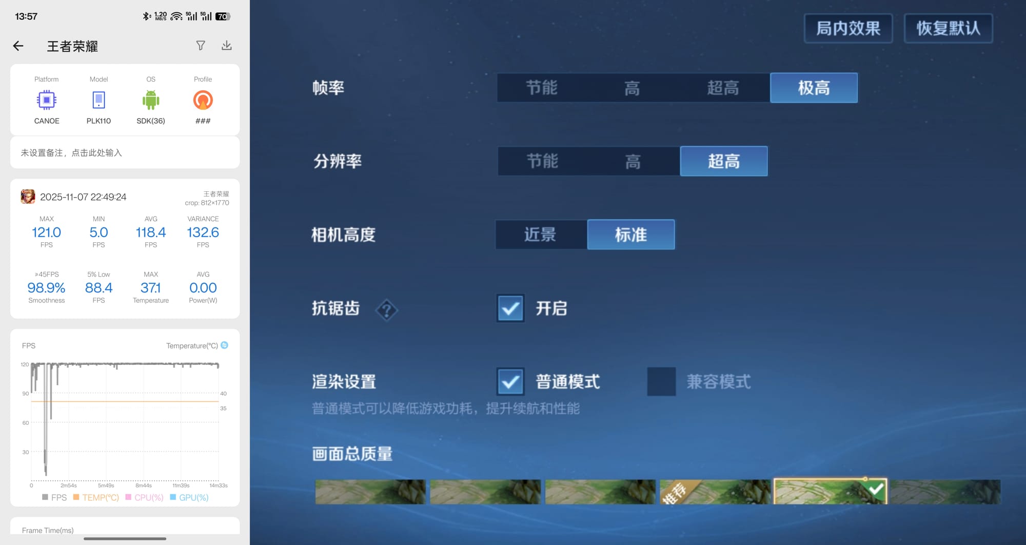 王者荣耀目前最高支持 120Hz 帧率,就算把画质拉满 —— 开启超高分辨率、极致特效和高清阴影,运行起来也完全无压力,整体体验流畅又稳定。