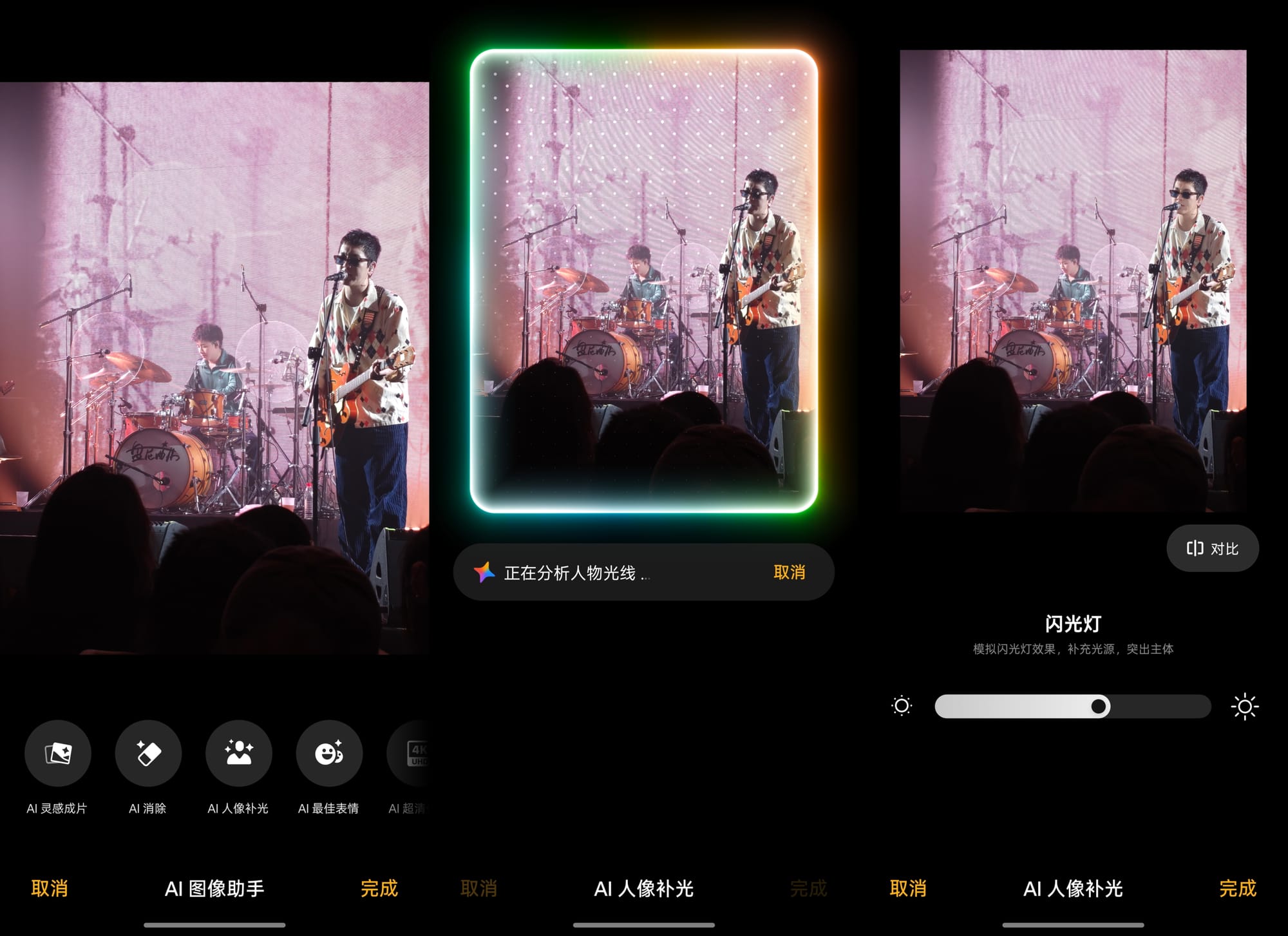 最后,我想提一下ColorOS新增的 AI 人像补光功能,尤其是在光线复杂的环境下真的很实用。在 演出现场Livehouse 拍摄时,经常会遇到舞台灯光强烈,导致拍出的人像面部偏暗。